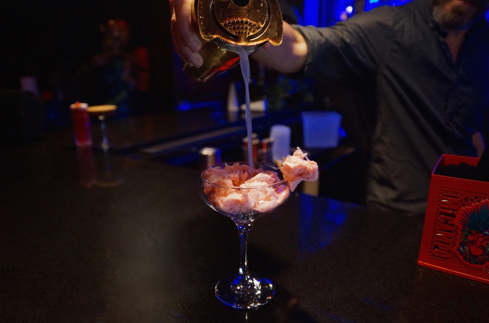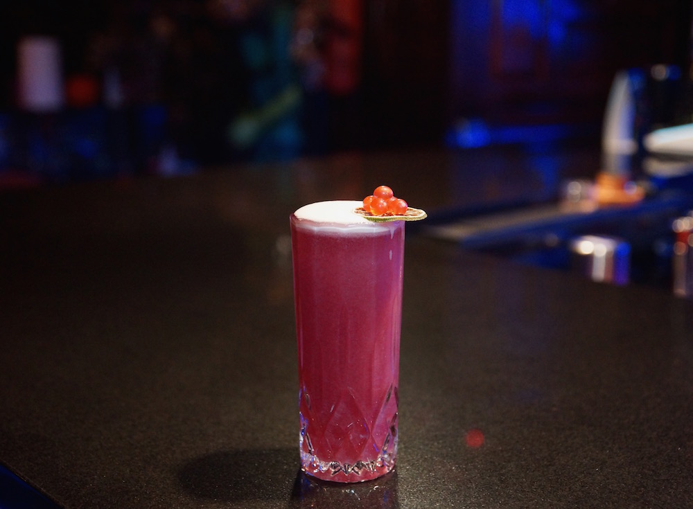 Rum Away with Me (dragon fruit rum, strawberry, pineapple, fresh lemon juice, whole egg, topped witih strawberry pearls) - Photo by Drink Philly